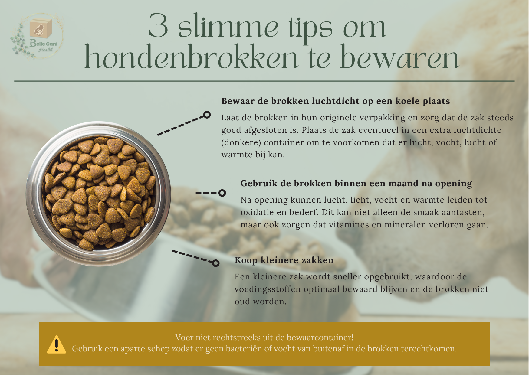 Download zeker onze bewaarkaart voor brokken met tips voor een optimale bewaring van hondenbrokken
