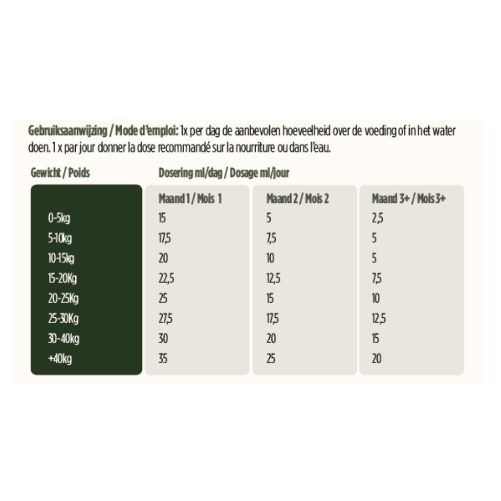 Zowel puppy’s, volwassen honden en zeker oudere honden hebben baat bij een toevoeging. Om het herstel op gang te brengen is in het begin een hogere dosis nodig die na 3 maanden op een normale hoeveelheid terug gebracht wordt ter onderhoud. Zowel puppy’s, volwassen als oudere honden hebben hier echt baat bij. Effecten zijn wel pas zichtbaar vanaf 6 weken. Het kan heel makkelijk over de brokjes of in het rauwvoer gedaan worden maar kan ook perfect in het drinkwater worden toegevoegd. Na 6 weken altijd een pauze van 1 week inlassen en dan opnieuw beginnen.
